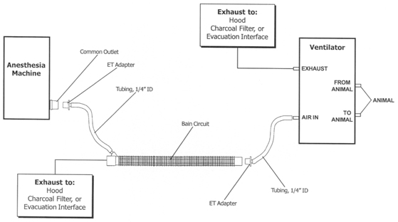 If external monitoring and adjustment of the pressures in the breathing circuit are not required, the diagram below shows an inexpensive alternative method for connecting an anesthesia machine to a piston-style ventilator using a Bain non-rebreathing circuit.