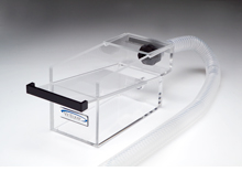 The vented induction chamber will eliminate exposure to waste anesthetic gases that are most common with traditional induction chambers. The patient is placed into the chamber via a sliding lid. With the lid in the closed position, anesthetic vapor/O2 is introduced into the chamber in the standard fashion. A constant vacuum is applied above the chamber to capture excess gas as it leaves the induction area. When the lid is opened, this vacuum creates negative pressure above the chamber, allowing safe removal of the animal and preventing excess vapor from reaching the investigator.